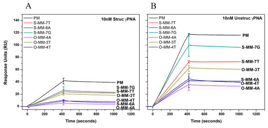 Surface plasmon resonance (SPR) sensorgrams for 10 nM struc_γPNA (A) and unstruc_γPNA (B). DNA target sequences are given in Table 1. All data are plotted as n = 3 average ± SD.