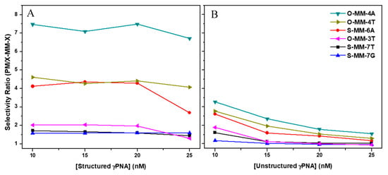 For the structured probe, the nature of the mismatch at position four has a significant effect on selectivity; the SR for O-MM-4A (A-G mismatch) is 70% higher than for O-MM-4T (T-G mismatch), likely due to the ability of the latter target to form a more stable G-T wobble pair with the γPNA probe [22]. In contrast, the unstructured probe only discriminates the G-A mismatch by 17% over the G-T mismatch. The nature of the mismatch at position 7 (T-T vs. G-T) does not significantly impact selectivity, although the SR < 2 for these targets leaves little opportunity for selectivity differences to emerge.