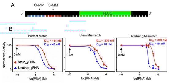 Both γPNA probes are complementary to a 10 nucleotide site at the 5′-UTR terminus of a firefly luciferase (Fluc) mRNA, which was shown previously to be a potent antisense target site for γPNA [24]. We also constructed mutant Fluc mRNAs bearing mismatches within either the stem (5′-AGACCUAGC-3′) or the overhang (5′-AGAACCAAGC-3′) regions of the target-recognition site (Figure 4A). These correspond to DNA probes S-MM-7T and O-MM-4A from the earlier experiments, where strong kinetic discrimination was observed for the overhang mismatch but not the stem mismatch (Figure 3).