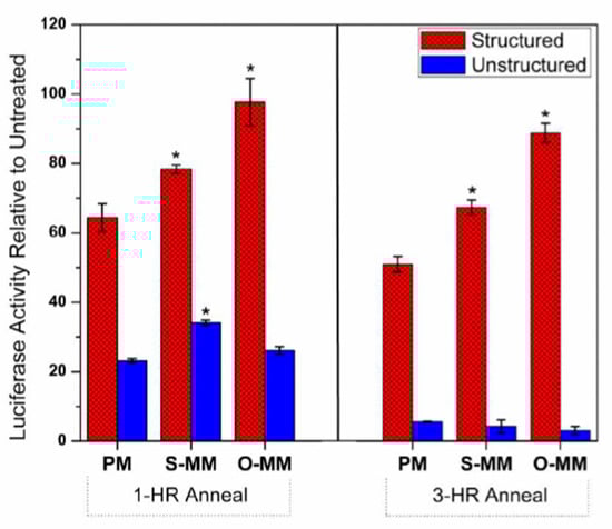 Effect of annealing time on antisense target discrimination. Samples contained 10 nM mRNA and 100 nM γPNA. Fluc activity was compared to control samples lacking either γPNA probe and are expressed as a percentage of activity on the y-axis. At a 1 h annealing time (left panel), the struc_γPNA demonstrated a statistically significant (* = p < 0.05) difference in luciferase inhibition between the perfect match (PM) and both mismatch targets, whereas the unstruc_γPNA only showed a significant difference between the PM and S-MM-7U. At a 3 h annealing time (right panel), there was no inhibition difference (p > 0.05) amongst the three targets when using the unstruc_γPNA, whereas the struc_γPNA retained discrimination of the mismatched targets. All data shown are presented as an average of n = 3 ± SD.