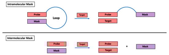 The simplest type of nucleic acid secondary structure is the hairpin, in which two remote complementary sequences form a stem through Watson–Crick base pairing, extruding the intervening nucleotides into a loop. One side of the stem, i.e., the probe, is complementary to the target, while the other side of the stem serves as the “mask”, which provides the competition (Scheme 1). The ability of a hairpin secondary structure to improve hybridization selectivity was first reported in the context of fluorescent molecular beacons [2,3] and has since been extended to other types of hybridization probes [4]. In addition, intermolecular masking of a probe through hybridization to a competing oligonucleotide in order to improve selectivity has also been reported (Scheme 1) [5,6].