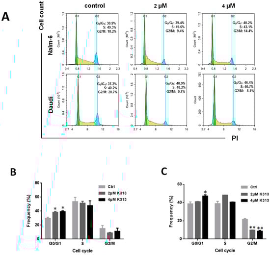 2.2. K313 Induces Moderate Cell Cycle Arrest at G0/G1 Phase in Nalm-6 and Daudi Cells