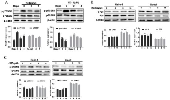 2.5. K313 Suppresses mTOR/p70S6K Pathway in Nalm-6 and Daudi Cells
