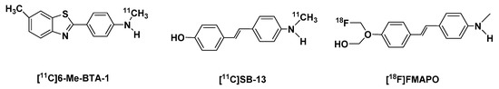 The discovery of [3H]SB-13, a stilbene derivative which showed a high binding affinity to postmortem AD brain homogenates [109], led to subsequent labeling with carbon-11 to afford [11C]SB-13 (4 methylamino-4′-hydroxystilbene) (Figure 2). The tracer displayed a good brain uptake and brain clearance (Table 1) [110]. In vivo human PET-imaging it displayed properties similar to PiB in discriminating between AD and non-AD patients [111].