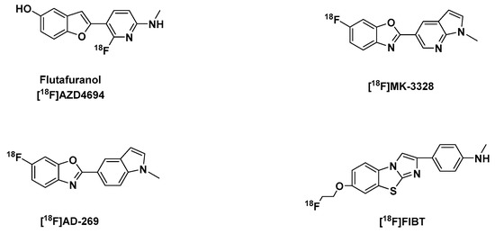 Other notable Aβ tracers include flutafuranol, also known as [18F]AZD4694 ([18F]NAV4694) (Figure 3) a benzofuran derivative, developed by researchers at AstraZeneca in Sweden [123]. Its development, amongst other second generation of 18F-labeled Aβ imaging agents [124] was spurred by the report that flutemetamol and florbetaben, have high level of non-specific white matter retention [116,125,126], which could be a limitation in situations when insoluble Aβ levels are low, due to a spillover effect of radioactivity to adjacent cortical regions from nonspecific binding in white matter. Hence, they may not be useful for correct mapping of Aβ plaque load in low-density regions and in prodromal phases of AD.