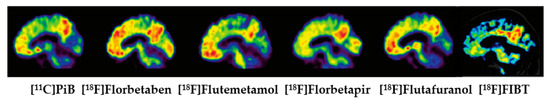 Exemplary sagittal PET images of the FDA approved Aβ PET-tracers of Alzheimer’s disease patients with other select featured tracers, [11C]PiB, [18F]Florbetaben, [18F]Flutemetamol, [18F]Florbetapir, [18F]Flutafuranol, and [18F]FIBT (reproduced with permission as agreed by Newlands Press Ltd. [135]).