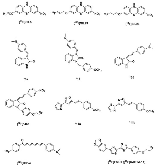 The development of amyloid-specific imaging compounds is based mostly on conjugated dyes like Th-T (Figure 1) and Congo red, that are used in postmortem AD brain sections for the staining of plaques and tangles [87,88,89,90]. The synthesis of the hundreds of the derivatives of the latter by the Pittsburgh group gave rise to a series of pan-amyloid imaging agents that showed nanomolar binding affinities for Aβ, tau, α-syn, and prion aggregates. Notwithstanding, a number of these compounds ionize at physiological pH, and for this reason did not achieve high brain uptake ( > 1 SUV) a few min post intravenous injection [32,91].