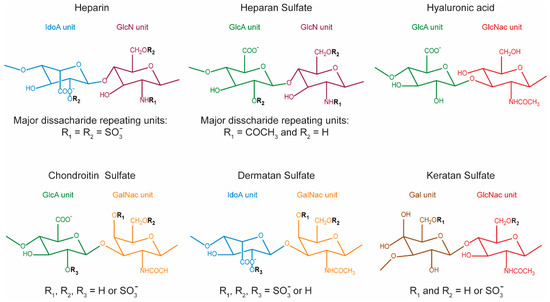 Structure of Glycosaminoglycans (GAG) molecules according to main disaccharide composition. GAG are composed of combined uronic acids [β-d-glucuronic acid (GlcA) or α-l-iduronic acid (IdoA)] and amino sugars [α-d- or β-d-glucosamine (GlcN), N-acetylglucosamine (GlcNac) or N-acetyl-galactosamine GalNac)]. From the combination of the different uronic acid and amino sugars, four main groups of GAG can be distinguished. (1) Heparin and Heparan Sulfate, R1=COCH3 or SO3− and R2=H or SO3−; Heparan Sulfate, R1=COCH3 or SO3− and R2=H or SO3−. Heparin and Heparan Sulfate share a common amino sugar (α-D-GlcN) but differ in their major uronic acid unit (α-l-IdoA in heparin and β-d-GlcA in heparan sulfate), linked by 1-4 glycosidic bonds. (2) Chondroitin Sulfate and Dermatan Sulfate also share the same amino sugar unit (GalNac) but their uronic unit is β-d-GlcA and α-l-IdoA, respectively. Chondroitin sulfates can be classified according to the position of the sulfates: R1=R2=R3=H (nonsulfated chondroitin), R1=SO3− and R2=R3=H (chondroitin-4-sulfate, CSA), R1=R3=SO3− and R2=H (chondroitin-2,4-disulfate, CSB), R2=SO3− and R1=R3=H (chondroitin-6-sulfate, CSC), R2=R3=SO3− and R1=H (chondroitin-2,6-disulfate, CSD), R1=R2=SO3− and R3=H (chondroitin-4,6-disulfate, CSE), R1=R2=R3=SO3− (trisulfated chondroitin). CS and DS can be found as co-polymeric structures and despite the difference in the uronic unit, DS is also known as chondroitin sulfate B (CSB). (3) Hyaluronan, or hyaluronic acid, is composed of β-1,4-d-GlcA and β-1,3-N-acetyl-d-GlcNac repeating units and is the only non-sulfated GAG. (4) Keratan sulfate has the particularity of not containing uronic acids, being composed of alternating units of galactose (β-1,3-d-Gal) and β-1,4-N-acetyl-d-GlcNac.