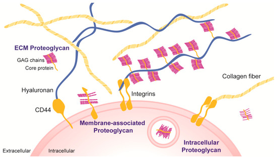 Localization of GAG and PG in native tissues. GAG associate covalently to core proteins forming proteoglycans (PG), with exception of HA. Instead, HA physically interacts with other GAG and PG through specific binding domains, as well as particular cell receptors (e.g., CD44). PG can be classified according to their location: They can be found inside cells in secretory compartments where they support storage of positively charged biomolecules (intracellular PG); at the cell membrane as membrane-associated PG where they are involved in cell–cell and cell–ECM interactions (membrane-associated PG) or be secreted to the ECM, where they play both biological and structural roles (extracellular PG).