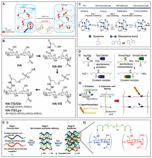 (A) Representation of coumarin derivatized HA undergoing crosslinking when exposed to near-UV light stimulus (λ = 365 nm) via photocycloaddition reaction between coumarin moieties and without any catalysts or radical initiators [45]. (B) Synthesis of HA derivatives incorporating transglutaminase (TG) peptides; thiol groups were incorporated in HA backbone via carbodiimide reaction (HA-SH); thiol groups were then substituted with vinyl sulfones (HA-VS) and subsequently with TG/glutamine (HA-TG/Gln) and TG/lysine (HA-TG-Lys) peptides via Michael addition; MMP cleavage site marked by an arrow, cysteines (C) that provide thiols for conjugation onto HA-VS are in bold and the Lys (K) and Gln (Q) covalently coupled to each other on their side chains by FXIIIa are underlined [39]. (C) Crosslinking steps of a HA-tyramine derivative bioink throughout the bioprinting process: step 1, the bioink is partially enzymatically crosslinked in the presence of HRP and H2O2 to improve extrusion; step 2, during extrusion, the bioink is exposed to green light to trigger photocrosslinking and stabilize the construct; step3, post-bioprinting, enzymatically driven functionalization of the scaffold to incorporate cell adhesive RGD motives [53]. (D) (i) SpyTag/SpyCatcher and SnoopTagJr/SnoopCatcher spontaneous amide bond formation; (ii) hydrogel network formation and functionalization with ligand of interest. Central sequence in TriCatchers may incorporate RGDSP-containing or MMP-cleavable linkers [56]. (E) (i) Representation of the HA/CS/PEGDA hydrogel and gelation process that leads to a polymeric network covalently crosslinked via thiol-ene Michael addition click reactions; (ii) chemical crosslinking of GAG thiol derivative mixtures, HA-SH (blue) and CS-SH (red), with PEGDA (green) by conjugate addition [58] (Reproduced with permission from [39,45,53,56,58]).