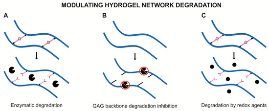 Schematic representation of main strategies to modulate network degradation of GAG-base hydrogels. To modulate network degradation, strategies can include enzyme sensitive sequences within crosslink bonds (e.g., MMP-sensitive peptide sequences) (A), or, oppositely, degradation can be inhibited at the level of GAG backbone by incorporation of functional groups that reduce GAG susceptibility to enzymatic cleavage (B). Crosslinking strategies can also be designed to be sensitive to redox agents (C).