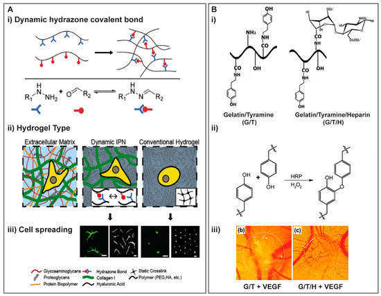 (A) HA/collagen IPN developed to mimic fibrillarity and viscoelasticity of the ECM. (i) Scheme of formation viscoelastic HA single network hydrogel via dynamic covalent hydrazone crosslinking and chemical structures of modified HA; (ii) representation of composition and network structure of ECM, dynamic HA-collagen IPN and conventional statically crosslinked hydrogel. (iii) MSC spreading is more pronounced in these dynamic IPN hydrogels with higher stress relaxation in comparison with more conventional hydrogels that have very low stress relaxation. [91]. (B) (i) Chemical structure of gelatin/tyramine (G/T) derivative and gelatin/tyramine/HEP (G/T/H) hydrogels; (ii) crosslinking mechanism by HRP and H2O2 addition to form injectable G/T/H hydrogels and (iii) comparison of new blood vessel formation of G/T and G/T/H hydrogels using an in vivo chicken chorioallantoic membrane (CAM) assay and after 5 days of incubation [103]. (Reproduced with permission from [91,103]).