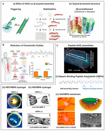 (A) (i) Schematic representation of GAGs interference on peptide self-assembly, either triggering formation or stabilizing preformed β-amyloid fibrils. (ii) Typical crystalline structure of Alzheimer’s disease Aβ plaques. Peptide β-strand segments orient parallel to the fibril cross-section (xy plane) and interact laterally to form long β-sheets aligned with the fibril long axis. Reproduced/adapted from [129,130] (i) and [128] (ii), with permission. (B) Positively charged, serine-rich peptide sequence bearing a pattern of alternating charged/polar and aromatic amino acids. CS induces self-assembling into β-sheet tapes improving GAG retention and restored compressive stiffness in an ex vivo model of denucleated intervertebral discs. Reproduced/adapted from [138], with permission. (C) Schematic representation of a peptide amphiphile (PA) self-assembling into nanofibers, which surface binds GAG molecules. Nanofiber cross-section shows PAs β-strands distributed radially and β-strands interacting laterally to form β-sheets aligned with the nanofiber long axis. (i) Chemical structure of a PA bearing a heparin binding sequence (HBPA). (ii) Hydrogels formed by HBPA and HEP showed FGF-2/VEGF retention, improving angiogenesis in a rat cornea model. (iii) Hydrogels formed by HBPA and HS showed BMP-2 retention and improved bone healing. (iv) Membranes formed by self-assembly of HBPA with HA and HEP showed FGF-2 and VEGF retention and enhanced angiogenesis in a CAM model. Membranes showed a hierarchical structure comprising a HBPA hydrogel region (1), a permeable membrane (2) and perpendicular nanofibers formed by GAG/peptide electrostatic interactions (3). (Reproduced with permission from [146] (i and ii), [153] (iii), [156,157] (vi)).