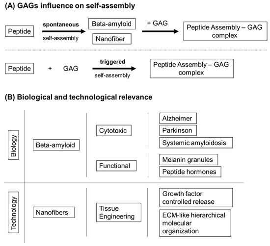 (A) GAGs can influence peptide self-assembly through two different general mechanisms, i.e., either nucleation or stabilization of self-assembled structures. (B) Interaction with self-assembling peptides has both biological and technological implications, since de novo designed peptide self-assembly systems retain structural hallmarks of beta-amyloids.