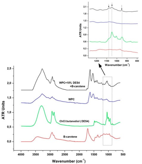 ATR-FTIR spectroscopy was performed to analyze the obtained capsules and verify the presence of the DES containing β-carotene in the capsules produced. Figure 2 shows the FTIR spectra of pure WPC, ChCl:butanediol (DES4), pure β-carotene crystals, and WPC + 10% DES4 + β-carotene capsules. The ATR-FTIR spectrum of the β-carotene-loaded encapsulate shows contributions from both the protein wall material and the DES4 solvent containing β-carotene. The characteristic bands of proteins (i.e., Amide I (ν C=O, ν C–N) at 1650 cm−1 and Amide II (δ N–H, ν C–N) at 1550 cm−1) were clearly discerned in the spectrum of the β-carotene-loaded WPC encapsulate [48]. The β-carotene-loaded encapsulate also showed a considerable relative increase in the absorbance of the bands between 2800 and 3600 cm−1 with respect to the pure protein, assigned to the contribution of the DES4 solvent. Thus, the bands between 3000–3600 cm−1 are attributed to DES solvent N–H and O–H groups [49], responsible for forming hydrogen bonds with carbonyl groups of the peptides in the proteins [50]; and the bands between 2800–3000 cm−1 are assigned to DES solvent C–H stretching vibrations of carbonyl groups [51]. In addition, the ATR-FTIR spectrum of the encapsulate containing β-carotene shows a new peak at 1080 cm−1, which corresponds to the C–O stretching peaks of the primary alcohol in ChCl:butanediol components in DES4 [52]. As seen from Figure 2, no characteristic peaks of β-carotene were detected in the ATR-FTIR spectrum of the encapsulate containing β-carotene. This is most likely due to the low concentration of β-carotene in the capsules, whose contribution would be masked by the intense peaks of the WPC. However, the presence of the DES bands suggests indirectly the presence of β-carotene, since the carotenoid is dissolved in the solvent. In any case, the presence of β-carotene in the capsules was confirmed by UV/Vis spectrophotometry as shown in the following section.