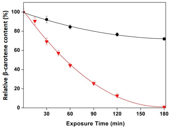 Relative photo-oxidation vs. UV/Vis exposure time in the β-carotene concentration measure by UV/Vis spectroscopy at 448 nm of (●) as WPC + 10% DES4 + β-carotene capsules, (▼) free β-carotene.