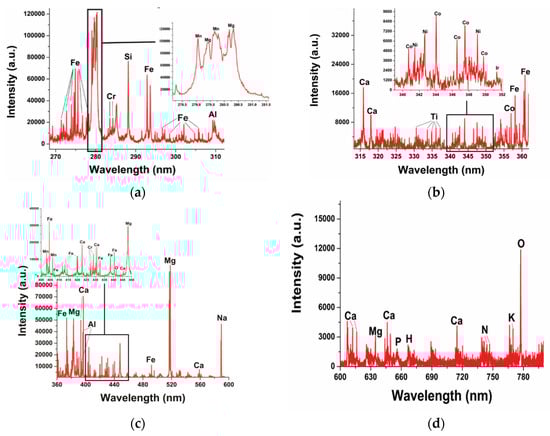 The spectral lines of the elements present in the LIBS spectra of the Dergaon meteorite are shown in Figure 1a–d. The distinct advantage of LIBS lies in its unique ability to detect heavy as well as light elements, as indicated in Figure 1.