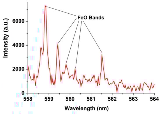 The spectral lines of characteristic trace elements observed in the LIBS spectra of the Dergaon chondritic meteorite include Cr, Co, Ni, and Ir, as shown in Figure 1b. It is essential to mention that Cr, Co, and Ni are also found in mafic-ultramafic terrestrial rocks. But iridium (Ir), a platinum group element, very rarely occurs in ultramafic rocks on Earth and is used to trace extraterrestrial signatures [21]. However, the extraterrestrial samples, like chondritic meteorites, show Ni/Cr > 1 and may contain substantial Ir. Furthermore, the wavelengths of spectral lines for characteristic elements found in the Dergaon meteorite included Ni I (338.05, 341.34, 342.37, 349.29 and 352.454 nm), Co I (340.51, 344.364, 347.39and 349.56 nm), and Ir I (351.364 nm). Identical spectral lines of these elements are also observed in meteorites, recently analyzed with LIBS [16]. An earlier study of the Dergaon meteorite reported the presence of noble gases and some light elements as well [2]. At a suitable gate delay, the signature of molecular emissions is also expected to occurwith LIBS Our experimental results reveal that the concentration of Fe and O in the present sample arean appreciable amounts, i.e., ≅ 28% and ≅ 34%, respectively. The high concentration of these elements may result in the formation of molecular bands in the recorded spectra [24,25]. Thus, we have tried to identify the molecular band of FeO in the LIBS spectra of theDergaon meteorite. Figure 2 displays signatures of molecular bands observed in the range of 558 to 564 nm.The molecular spectra belongs to the orange band system of the FeO molecule [26].