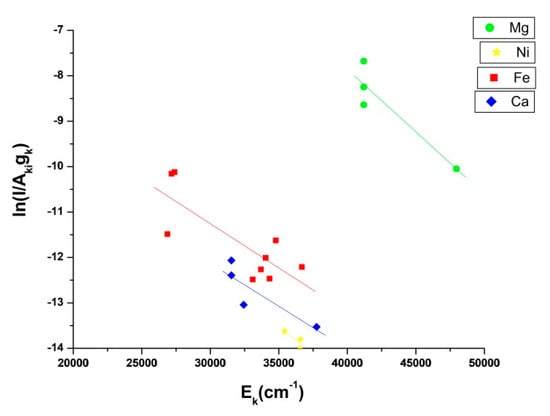 For the determination of the plasma temperature, a graph of vs. was drawn, viz. a Boltzmann plot was constructed as illustrated in Figure 3.