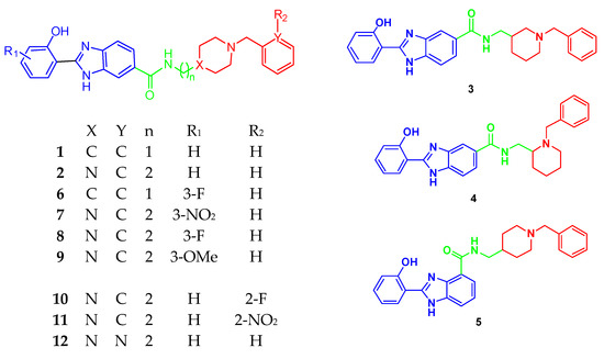 This subject has also been one of the main recent aims of our research group, with MTDLs enclosing a molecular fragment based on AChEi drug (e.g., Tacrine, DNP), which has been derivatized with a variety of functional moieties, several of them including metal chelating groups (such as cysteine, hydroxypyridinone, hydroxycinamate, hydroxybenzofurane, and hydroxyphenylbenzimidazole (BIM)) [19,20,21,22]. The interesting properties revealed by the recently reported novel tacrine-hydroxyphenylbenzimidazole (TAC-BIM) hybrids [22] led to the development of other MTDL analogues, by attachment of a BIM group to DNP active mimetic ligands (benzyl-piperidine/benzyl-piperazine), to assure AChEi, inhibition of Aβ aggregation and modulation of metal dyshomeostasis [23]. As a continuation of our efforts to search for new DNP-BIM hybrids, herein we present a series of analogues (see Figure 1), which aims to explore the effect of positional isomerization and introduction of a substituent on each of the above referred main multiple anti-AD properties as well as on drug-likeness prediction. Discussion is also provided by establishing comparison with previously reported DNP-BIM hybrids.