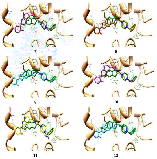 Docking studies were performed with this set of new hybrids in order to gain some insight into the differences in their binding interactions with the active site of AChE. Specifically, it was intended to understand the effect of positional isomerization and of specific substitutions in the benzylpiperidine, benzylpiperazine, and hydroxyphenylbenzimidazole (BIM) moieties on the ligand-enzyme binding, namely in the dual binding mode. Similarly, as previously reported for compounds 1 and 2, the docking simulations of this set of hybrids were performed with AChE (PDB code: 1EVE) [24], using the X-ray crystal structure of the TcAChE complex with DNP. Firstly, the co-crystallized ligand (DNP) was docked back into the binding site of the enzyme and superimposed with the native ligand (Figure S1). Being satisfied with the good overlay, the same docking protocol was used for further docking studies with the target compounds. The best docked poses of each synthesized compound were selected and superimposed with that of DNP, as shown in Figure 2. Similar to the already published simple analogues (1, 2), they showed a pattern of orientation resembling that of DNP. In particular, all the compounds have the first pharmacophore moieties, namely the benzyl-piperidinium (3–6), -piperazinium (7–11), or -pyridinium (12), anchored to the CAS of AChE (bottom of the gorge), through binding interactions via aromatic π-π stacking with the phenyl ring from Trp 84A; at the middle of the gorge, the charged nitrogen atom can establish a cation–π binding interaction with the phenyl group of Phe330. Noteworthy is the observation that the benzyl-piperidinium moieties of positional isomers (3–5) present some bending relative to that of DNP, though no significant effect appeared on the complexes with the benzyl-piperazinium substituted (10, 11) or the benzyl-pyridinium (12) moieties. Regarding the BIM moieties, similar to the DNP indanone ring, these moieties are at the entrance of the gorge interacting via π-π stacking with the peripheral anionic residue Trp279. However, these docking simulations indicate for the BIM moieties less favorable interactions with PAS than DNP, which can be mainly attributed to the fact that the tricyclic BIM moieties are longer than the bicyclic indanone moiety of DNP. Furthermore, some additional distortion seems to occur for positional isomers (3–5) and substitution with big size substituents (-NO2, 7; -OMe, 9). In fact, the AChE inhibition assays herein performed (see Section 2.4.1) confirm lower inhibitory activity for 4, 5, 7, and 11, probably due to the existence of distorted configurations of these compounds inside the active site of the enzyme. Interestingly, the substitution by the small size fluorine atom (8, 10) does not seem to contribute to any further distortion, as compared with the simple analogues (1, 2), though from the docking studies we cannot observe any engaged positive binding interactions.