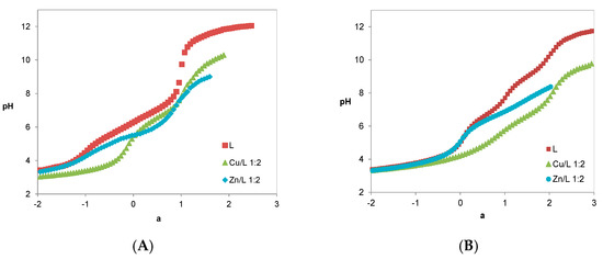 Potentiometric titration curves of compounds 7 (A) and 12 (B) (CL = 6.7 × 10−4 M, a represents moles of added base per mole of ligand). Experimental conditions: 50% w/w DMSO/water, I = 0.1 M KCl, T = 25.0 ± 0.1 °C.