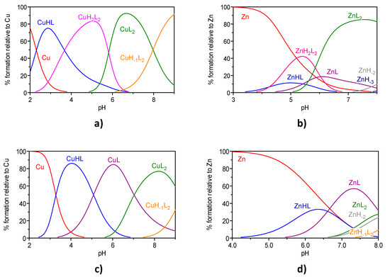 Species distribution curves for the 1:2 M(II)/L systems with compound 7 and a) M = Cu, b) M = Zn, as well as with compound 12, and c) M = Cu, d) M = Zn (CL = 6.7 × 10−4 M).