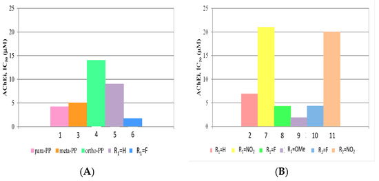 In order to understand the effect of different structural changes on the inhibitory capacity of AChE such as the existence of positional isomers (compounds 1, 3, and 4) or the inclusion of R1 or R2 substituents, a brief structure-activity analysis can be performed based on graphical representation of the enzymatic activity (IC50) (Figure 5).