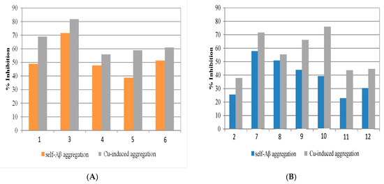 Herein, due to solubility problems of some compounds in the phosphate buffer (0.215 M, pH 8.0) of the working medium, the assays were carried out in the presence of 40 μM concentration of inhibitor and 20 μM in the case of compound 4, instead of 80 μM as previously reported [33]. The obtained data, expressed as percentage of aggregation inhibition, is included in Table 2 and graphically presented in Figure 6. The results show that all the compounds are able to inhibit Aβ aggregation with good-to-moderate activity. The activity dependence on ligand structural features may be mainly explained by the different ability for intercalation into the fibrils, as already assumed for other inhibitors [22,40]. Among the hybrids under study, 3 exhibited the highest inhibitory activity for self- and Cu-induced Aβ aggregation, although very good inhibitory activity is also presented by 1, 6, and 7. The data obtained for compounds 6 and 7 indicate that the presence of R1 = F, -NO2 substituents in the BIM have some small positive effect on the inhibition of Aβ aggregation. On the other hand, compounds 5, 10, 11, and 12 showed decreased inhibitory activity, which may result from a somehow more difficult intercalation into the fibrils, when there is an ortho-attached BIM or when the PZ benzyl unity is substituted.