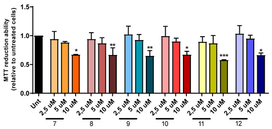Dose-response screening to select non-toxic concentrations of compounds 7–12. Cells were treated with different concentrations of the compounds for 24 h and MTT reduction assay was performed to evaluate cell viability. Results are expressed relatively to SH-SY5Y untreated cells, with the mean ± standard error of the mean (SEM) derived from four different experiments. * p < 0.05; ** p < 0.01; *** p < 0.001, significantly different when compared with SH-SY5Y untreated cells.