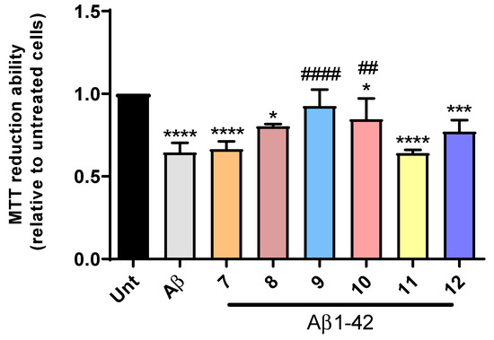 Neuroprotective effect of compounds 7–12 from Aβ42-induced toxicity on SH-SY5Y cells. Cells were treated with Aβ42 peptide (1 µM) for 24 h in the presence or absence of the compounds (1 h pre-incubation plus 24 h co-incubation). Evaluation of cell viability was performed using the MTT reduction assay. Results are expressed relatively to SH-SY5Y untreated cells, with the mean ± SEM derived from four different experiments. * p < 0.05; *** p < 0.001; **** p < 0.0001, significantly different when compared with SH-SY5Y untreated cells; ## p < 0.01; #### p < 0.0001, significantly different when compared with Aβ42 treated SH-SY5Y cells. The concentration used for all the compounds was 2.5 µM.