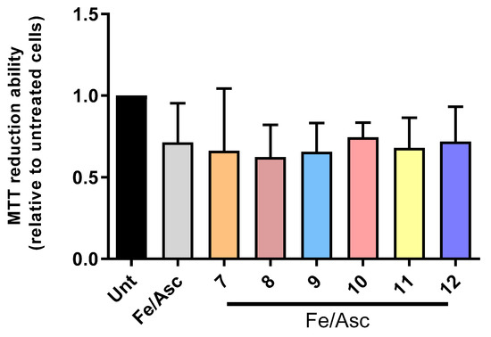 Neuroprotective effect of compounds 7–12 from L-Ascorbic Acid (AscH (-))/Ferrous sulphate (Fe) toxicity on SH-SY5Y cells. Cells were treated with Fe/Asc (2.5 mM and 5 mM, respectively) for 24 h in the absence or in the presence of the compounds (1 h pre-incubation plus 24 h co-incubation). Evaluation of cell viability was performed using the MTT reduction assay. Results are expressed relative to SH-SY5Y untreated cells, with the mean ± SEM derived from four different experiments. The concentration used for all the compounds was 2.5 µM.