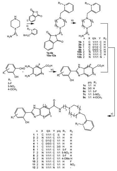 Twelve hybrid compounds resulted from the conjugation of a hydroxyphenylbenzimidazole (BIM) moiety with benzylpiperidine (PP, 1, 3−6), benzylpiperazine (PZ, 2, 7−11), and also benzylpyridine (12). The hybrids were obtained by following the convergent synthetic approach depicted in Scheme 1. The preparation of each final intermediate moiety, b-series of benzyl amine derivatives (1–4b and 10–12b) and c-series of carboxyl BIM derivatives (1c, 5–9c), involved mostly procedures previously reported [22,23]. More specifically, the synthesis of the benzyl-cyclic amino derivatives (b-series) involved a first one-pot-two-step reaction, with preliminary protection of the primary alkylamine group to a phthalimide group by its reaction with phthalic anhydride (FA) in absence of solvent and subsequent benzylation of the secondary cyclic amine with benzyl bromide in dry acetonitrile under basic conditions; the final deprotection of the primary amine was performed with hydrazine hydrate in refluxing ethanol. The preparation of the c-series of intermediates, hydroxyphenylbenzimidazole acid derivatives, involved the cyclization of diaminobenzoic acid derivatives with diverse salicylaldehydes, in the presence of sodium metabissulfite and N,N-dimethylacetamide (DMA) (method A) [22]. However, for some compounds (6c, 7c, 9c), an eutectic solvent mixture, choline chloride/glycerol (ChCl/Gly), was used (method B) instead of DMA, with improved effectiveness [25]. The last reaction step involved the coupling of amine intermediate moieties (b-series) with carboxylic intermediate moieties (c-series), via amide formation, and it was carried out in dry DMF, using NHS and DCC as activators.