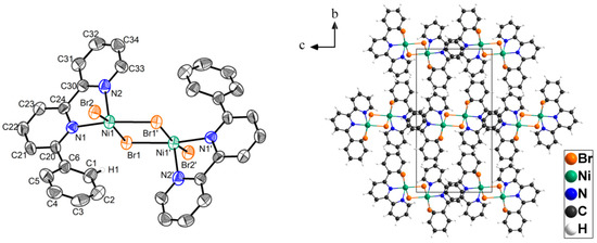 Ellipsoid view (two asymmetric units resulting in a binuclear structure) of [Ni(HPhbpy)Br2]2 (left) and crystal structure of [Ni(HPhbpy)Br2]2 viewed along the a axis (right). Ellipsoids are drawn at the 50% probability level.