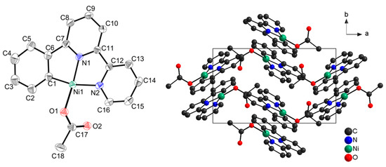 Ellipsoid view of [Ni(Phbpy)(OAc)] (left) and crystal structure viewed along the c axis (right). Ellipsoids are drawn at the 50% probability level.