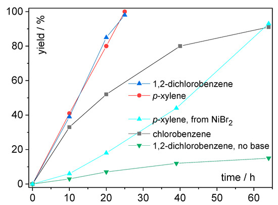 A detailed look on the time-dependence of the reaction for selected examples (Figure 3) shows that p-xylene and 1,2-dichlorobenzene reach high yields already after about 20 h, while chlorobenzene requires at least 40 h. Using NiBr2 instead of [Ni(HPhbpy)Br2]2 for the reaction in p-xylene under the same conditions afforded only 18% yield after 20 h but could be brought to 93% yield when heating for 64 h. This observation is in line with the assumed pre-formation of the p-xylene-soluble [Ni(HPhbpy)Br2]2 from insoluble NiBr2. Finally, a blank experiment in 1,2-dichlorobenzene (no external base) delivered a mediocre 15% yield after 64 h.