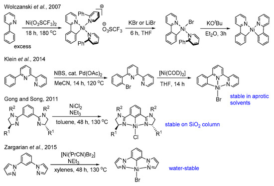 General considerations: In comparison with Pt or Pd congeners, cyclometalated Ni(II) complexes are less stable due to weaker Ni‒C and Ni‒N bonds [38,53]. The Ni–N bond, being also weaker than Ni–P bonds, is susceptible to facile ligand substitution by oxygen donors (e.g., alcohols) even in the case of chelating N^N-donors. [46]. The Ni–C bond is also chemically unstable. In addition to facile hydrolysis [46], oxygen insertion can occur in the presence of dioxygen with the formation of C‒O‒Ni bonds [54,55]. Thus, the cyclonickelation in this study was conducted under N2 atmosphere in solvents purified by distillation over Na-benzophenone ketyl (toluene or THF) or rigorously dried molecular sieves (chlorobenzene, 1,2-dichlorobenzene, and benzonitrile).