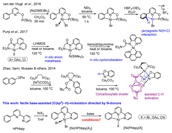 In sharp contrast to the literally thousands of examples available for Pd(II) and Pt(II), cyclometalated Ni(II) derivatives of nitrogen-donating π-conjugated moieties have remained rare species, although the first example of a cyclometalated Ni(II) complex, [Ni(Cp)(o-phenylazo)-phenyl)], was prepared from [Ni(Cp)2] (Cp− = cyclopentadienide) in 1963 [26]. Van Koten et al. introduced two approaches for the synthesis of Ni(N^C^N)-pincer complexes: (a) transmetalation of a Au(I) precursor; or (b) oxidative addition of zero-valent nickel to the bromoaryl precursor [27]. Much later, Wolczanski et al. directly metalated 2-phenylpyridine under harsh heating conditions (Scheme 1) [28], whereas Klein et al. performed a two-step cyclometalation via Pd-directed ortho-bromination of 6-phenyl-2,2′-bipyridine followed by the oxidative addition of zero-valent nickel, akin to van Koten’s approach [29,30]. Direct, base-assisted metalation with NiCl2 was demonstrated by Gong and Song in a pincer topology [31] and, in a similar approach by Zargarian et al. [32], it was found to be also feasible in macrocyclic N^C^N^C or N^C^N^N setups [33]. These reactions were considered to be electrophilic substitutions (H+ versus Ni(II)) that are archetypal for Pt(II) and Pd(II) complexes [1,25] but quite unique for Ni(II). Mechanistic insights were provided by van der Vlugt et al. for the formation of a [Ni(CNP)Br] pincer complex from the tetrahedral [Ni(HC^N^P)Br2] precursor using NEt3 as a base (Scheme 2) [34]. The isolation of a tri-coordinated T-shaped Ni complex with weak (an)agostic Ni…(H‒C) interaction invokes C‒H bond coordination to Ni(II), forming a sigma-complex as a key step of the process with base neutralising the proton outside of the coordination sphere.