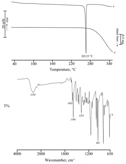 In our study of the inclusion of RSV in methylated CDs [24], we presented comprehensive quantitative thermal and FT-IR data for the commercially available sample of RSV used in the present study. Figure 2 shows the respective TGA and DSC traces (curves a’, a) as well as the FT-IR spectrum (b) of RSV. These serve as reliable references for identifying the pure bioactive compound.