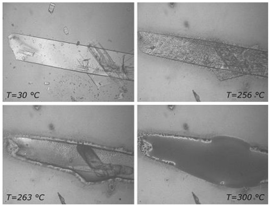 Table S1 (Supplementary Material, File 1) lists pertinent thermal parameters of the solid phases obtained by recrystallization of commercial RSV from a variety of pure solvents and various aqueous solutions. These data confirm that all the recrystallized samples of RSV isolated correspond to the same polymorphic form, which we also determined corresponds to the commercial material employed. However, the data in Table S1 also indicate different degrees of crystallinity for these samples, as is evident from variation in their enthalpies of fusion. Furthermore, some extent of overlap of the decomposition and melting processes also has to be taken into consideration, as it contributes to inaccuracy in the evaluation of the enthalpies. Figure 3 shows, as an example, HSM (hot stage microscopy) images of the sample obtained by recrystallization of RSV from MeOH/H2O (7:3 v/v). The crystals displayed blade-like morphology at room temperature and on heating shrank slightly but retained their original shape until they melted at approximately 260 °C, prior to decomposing.