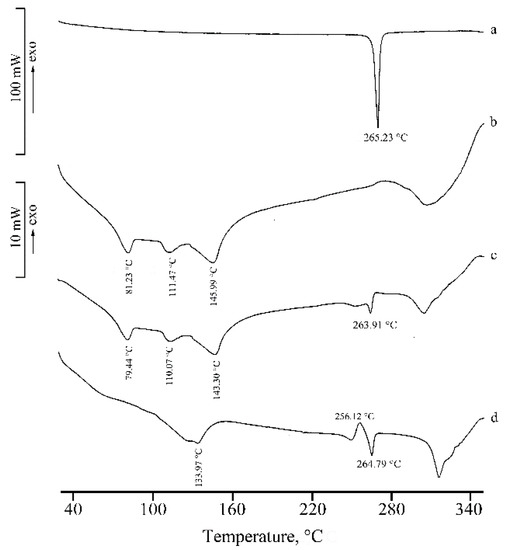 Figure 4 shows the DSC curves of RSV (a), α-CD (b), their physical mixture (PM) (c), and the product from KN (d). In the DSC curve of α-CD, three distinct effects are present in the temperature range 30–160 °C, attributed to sample dehydration with TGA overall mass loss of 10.3(4)% (curve not shown), in agreement with the theoretical value (10.0%), followed by melting with concomitant decomposition at around 270 °C. The presence of the drug melting endotherm is evident in both the DSC curve of the PM and in the trace following the kneading treatment to which the binary mixture was submitted. This effect was accompanied by an endo-exothermic effect at 249 and 256 °C, respectively, probably due to partial amorphization of the sample.