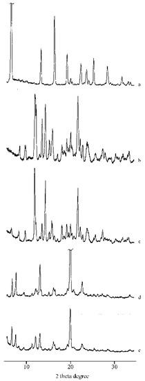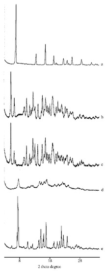 Figure 10 shows the PXRD patterns recorded for the bulk materials (patterns a and b) compared with their PM (pattern c) or after KN treatment (pattern d). The presence of a new series of peaks in the pattern of the KN product confirmed the interaction between RSV and γ-CD revealed by thermal analysis and FT-IR spectroscopy. The pattern (d) represents the same phase as that of pattern (e), the latter being a sample of higher crystallinity obtained by recrystallizing the PM from EtOH/H2O (1:1 v/v), the resulting product being labelled CCP (for ‘co-crystallization product’). As far as the feasibility of complexation is concerned, more definitive conclusions can be drawn in this instance because the detailed profile of the peaks in pattern (e) corresponds to a common PXRD pattern displayed by the well-known isostructural series of tetragonal γ-CD inclusion complexes containing a variety of guest molecules [30]. This correspondence thus proves that the phase depicted in pattern (e) is a genuine γ-CD inclusion complex crystallizing in the tetragonal space group P4212, for which the unit cell parameters should have values a ≈ 23.8 Å, c ≈ 23.0 Å, by analogy with the data for the isostructural series. These conclusions were subsequently confirmed by single crystal X-ray analysis of the γ-CD·RSV complex (Section 2.2).