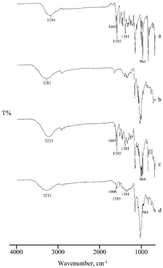 This effect is also confirmed by the broadening of the absorption bands in the FT-IR spectrum of the MW product (Figure 6, spectrum d), where the characteristic bands of RSV are present at unchanged wavenumbers but with lower intensity.