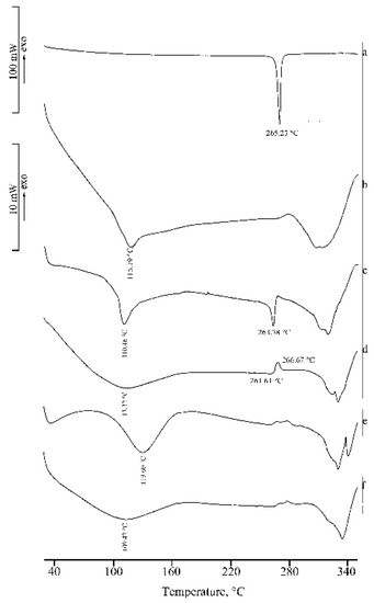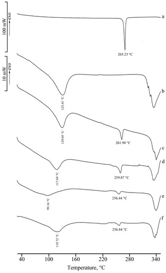 Figure 8 presents the DSC curves of RSV (a), γ-CD (b), their PM (c), and the latter after treatments by KN (d), MW (e), and CP (f), respectively. γ-CD is a crystalline sample characterized by a DSC curve showing a broad dehydration endotherm (Tpeak = 115(3) °C), which corresponds to a TGA mass loss of 8.3(6)% (curve not shown) and melting with decomposition at ~300 °C. The melting endotherm of RSV is still present in the DSC profile of the PM, although with melting enthalpy value much lower than that of the pure material (ΔHm = 30(2) J·g−1) because of a solid-state interaction between RSV and the CD. However, the RSV melting endotherm is not evident in the treated samples and instead an endo-/exothermic effect at ~260 °C appears in their DSC traces, being more pronounced in the KN product (d) and attributed to inclusion complex formation between RSV and the carrier.