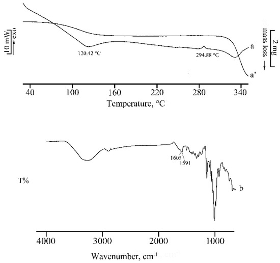 DSC and TGA curves (a, a’) for the γ-CD·RSV complex and its FT-IR spectrum (b).