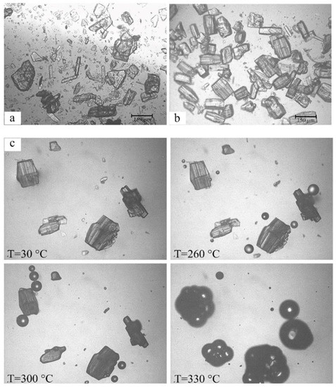 In Figure 12, the photomicrograph recorded for the PM (a) shows two crystal phases, namely those of RSV and γ-CD, while the CCP product (b) shows the typical columnar and bipyramidal crystal morphologies displayed by tetragonal γ-CD inclusion complexes. The HSM images for the sample (c) confirmed the isolation of a new phase. During heating, the crystals lost their opacity and at ~160 °C, in accord with the sample desolvation recorded on TGA analysis, loss of the solvents of crystallization (water, ethanol) was observed as bubbles escaping into the silicone oil in which the sample was immersed. Decomposition began at 300 °C and the complex decomposed completely at 330 °C without any clear melting point, as is typical for γ-CD complexes.