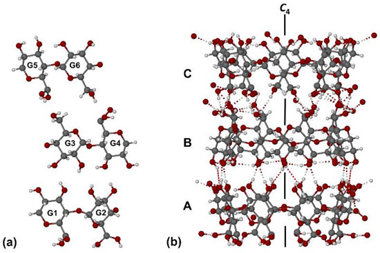 The three distinct pairs of glucopyranose units in the asymmetric unit of the (γ-CD)3·(RSV)4·(H2O)62 complex (a) and the resulting stacking of the three unique γ-CD molecules parallel to the crystal c-axis (b). Intramolecular and intermolecular O-H···O hydrogen bonds are indicated by dotted lines.