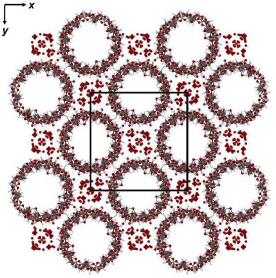 A common drawback in the X-ray structural elucidation of γ-CD inclusion complexes crystallizing in the space group P4212 is that the guest molecules are generally disordered since they are located within infinite channels of fourfold rotational symmetry generated by overlap of the central cavities of the stacked macrocyclic molecules. Exceptions to this general situation occur when the guest molecule itself possesses fourfold symmetry (e.g., 12-crown-4), resulting in an ordered crystal structure [31], this case being shown in Figure S2 in the Supplementary Material. In the case of the RSV complex presented here, following structural refinement of the host and water molecules, the highest difference electron density (Δρ) peak within the channel was only 0.75 eÅ−3 (about twice the value for an average hydrogen atom in a small-molecule structure) and no meaningful candidate guest peak connectivity was evident. This is typical of complexes in this isostructural series and a value of ~0.100 for the R1 factor (as recorded above for the RSV complex) is likewise typical, its relatively low value indicating that the host assembly is structurally very well-defined while the guest molecules contribute little to the overall X-ray scattering from the crystal due to their severe spatial disorder. Of the estimated ~21 water oxygen atoms per γ-CD molecule expected from the measured TGA mass loss for dehydration of the RSV complex, approximately 15 could be accounted for in the structural analysis and were added to the model. The majority of these also displayed partial occupancy. Figure 14 shows the projection of the crystal structure down the crystal c-axis. The disordered RSV molecules are present within the apparently ‘empty’ channels. Clusters of water oxygen atoms (small red spheres) occupy the interstitial sites. Water molecules engage in extensive hydrogen bonding with each other and with the infinite columns of γ-CD molecules, stabilizing the crystal structure.