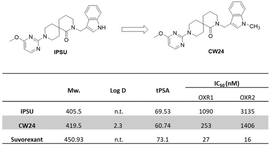 Structures and physicochemical properties of IPSU and CW24 (n.t. = not tested). IC50 of IPSU, CW24 and suvorexant were measured by a radioligand competition binding assay.