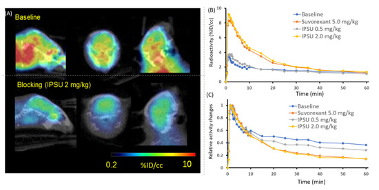 We performed PET-computed tomography (CT) imaging on mice to test [11C]CW24 as a neuroimaging probe for OXR imaging in vivo. [11C]CW24 exhibited high brain uptake (%ID/cc = 3.5% at Cmax, 1.5 min post-injection). In general, %ID/cc above 0.1% in rat or 0.01% in non-human primate within 5 min post-injection is above the threshold for suitable BBB penetration for CNS PET imaging studies [37]. Next, to evaluate the specificity of [11C]CW24 for OXRs, PET-CT imaging studies were performed in mice after 5 min pretreatment with IPSU (0.5 and 2.0 mg/kg; i.v.) or Suvorexant (5.0 mg/kg; i.v.). Time-activity curves (TACs) were normalized for peak uptake (~20 seconds post-injection in these studies) (Figure 3). Approximately 10% reduction in [11C]CW24 uptake with 0.5 mg/kg IPSU administration in 30–60 mins post-injection of [11C]CW24. In addition, approximately 50% reduction was found when the blocking dose of IPSU was increased to 2.0 mg/kg. Suvorxant (5.0 mg/kg) administration at 30–60 mins post-injection of [11C]CW24 also showed ~50% reduction in the mouse brain. Following IPSU pretreatment, [11C]CW24 binding was reduced in a dose-dependent manner in the brain for the relative radioactivity changes after administration. These results strongly support that [11C]CW24 binds selectively to the OXRs in vivo.